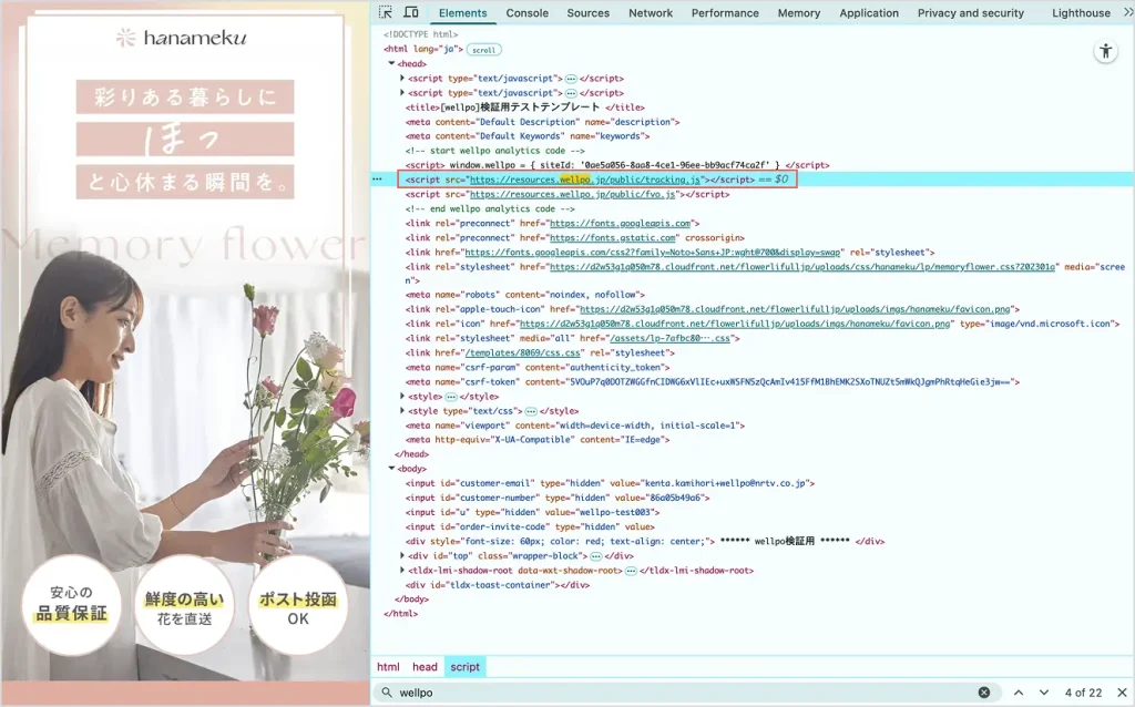 1で設定したトラッキングコードが正しく貼り付けられているか、デベロッパーツールで確認します。